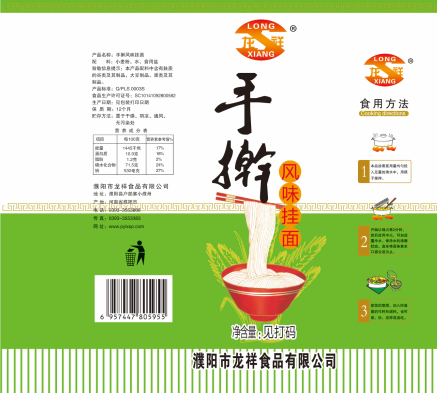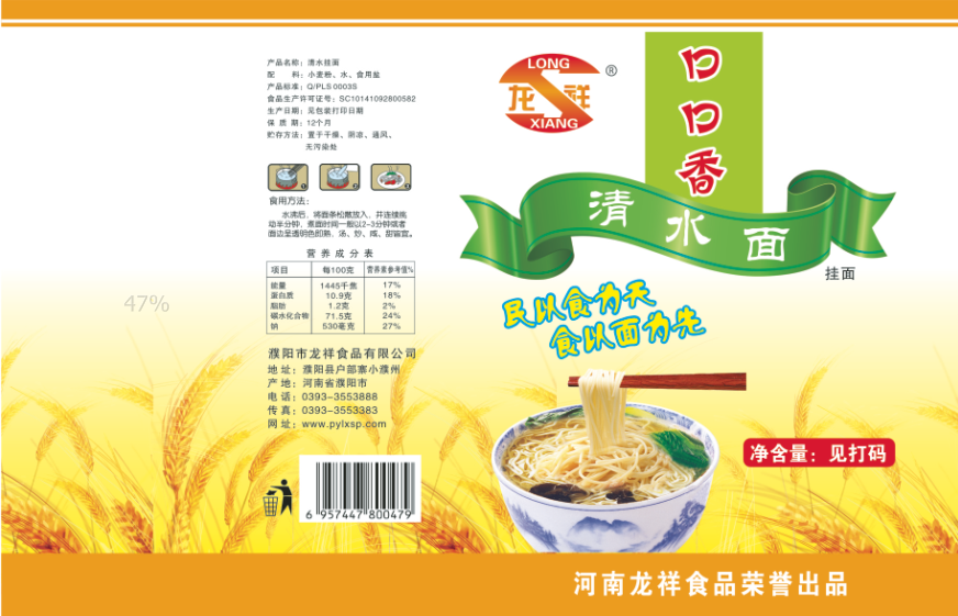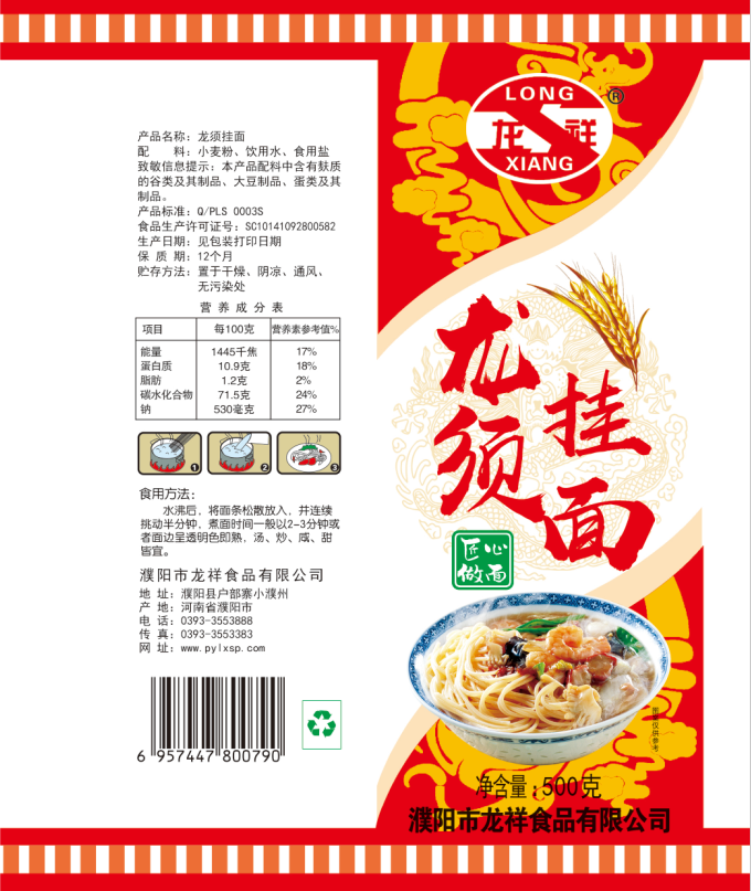 濮陽市龍祥食品有限公司位于河南省濮陽縣戶部寨鎮(zhèn)小濮州,始建于1994年,前期投資200萬元,經(jīng)過幾年的努力,大力開發(fā)市場,由于市場的需求量急劇上升,出現(xiàn)供不應(yīng)求,于2004年擴(kuò)建,建成一座新型的現(xiàn)代化面粉加工企業(yè),并擁有全國先進(jìn)全自動(dòng)生產(chǎn)設(shè)備一套,產(chǎn)量由以前的100噸/天,提高到現(xiàn)在400噸/天。 2012年再次擴(kuò)大規(guī)模申請(qǐng)為濮陽市龍祥食品有限公司,注冊(cè)資金500萬元。2012年又投資800萬元新建掛面生產(chǎn)線一條,日產(chǎn)掛面50噸。龍祥食品有限公司現(xiàn)有職工120余人,總工程師1人,專業(yè)技術(shù)人員10人,經(jīng)濟(jì)師1人,會(huì)計(jì)師1人,銷售人員2人,優(yōu)秀專業(yè)人員20余人。  龍祥公司自創(chuàng)建以來,社會(huì)效益十分可觀。公司一直以“今天的質(zhì)量,明天的市場”為信念,“一切為了客戶需求,竭誠追求完美品質(zhì)”為企業(yè)宗旨,走專業(yè)化經(jīng)營和職業(yè)化管理的路子。